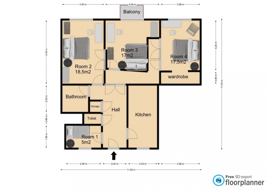 DESCRIPTION: FLATSIZE: 95 m2 (4 bedrooms, kitchen/ dining room, hall, 1 bathroom, 1 separated toilet
