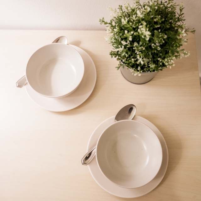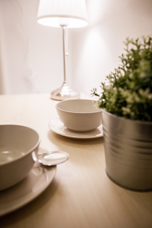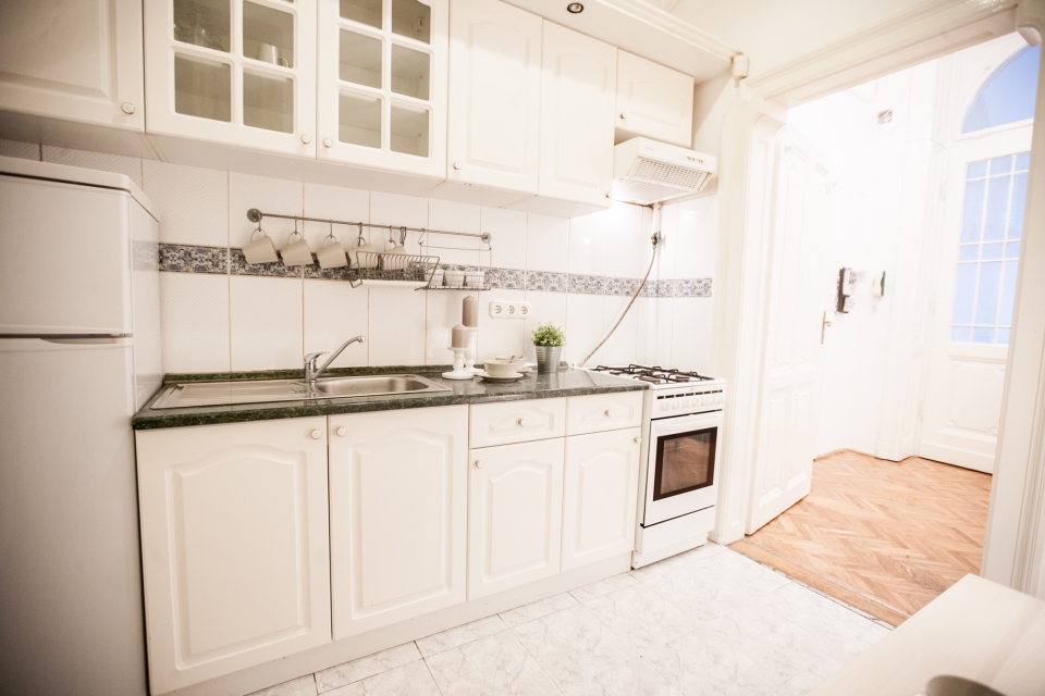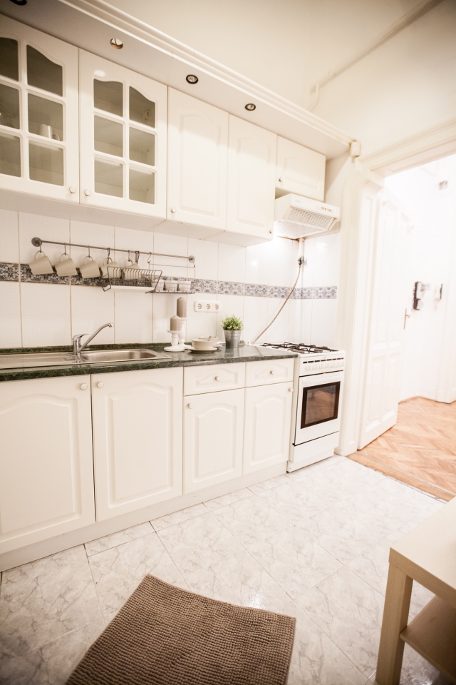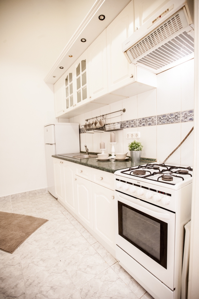 KITCHEN: stove, owen, microwave, sink, kettle, cooking set, dinner set,